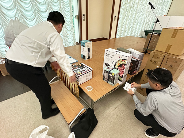 ここからは会場に景品を運んで、景品に熨斗の張り付けと、飾り付けをしていきます。