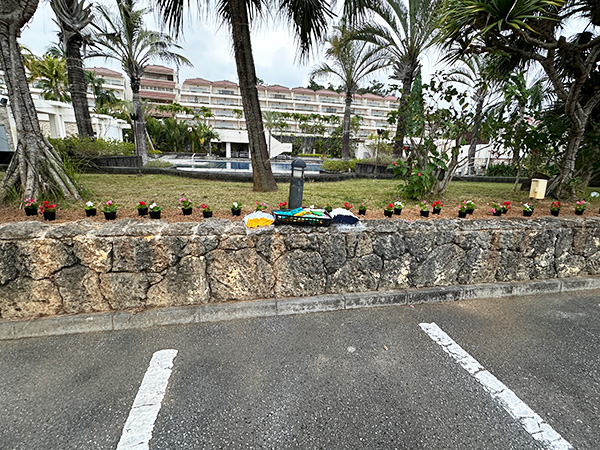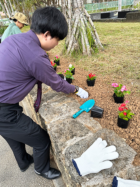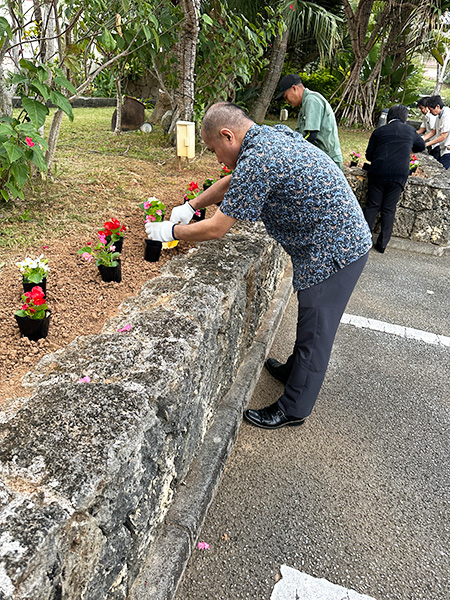 平良次長と比嘉専務による挨拶が終わり、集まった人たちが中央から軍手とスコップを手にとり花苗を植えていました。