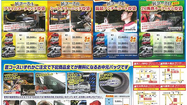 この夏、白石の匠があなたの愛車を塩害・暑さ・雑菌から守ります! 暑中お見舞い申し上げます。 4つのお中元 夏得袋!! 2017年7月~8月末までキャンペーン実施中です!!! これだけの匠コースがあれば現在、愛車のお手入れ…
