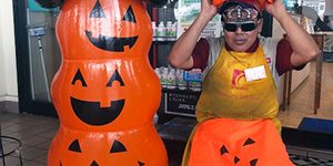 ある日の夜10時過ぎ、1BOXのレンタカーで来店のお客様トイレを貸して欲しいと言うので「あちらからどうぞ」とご案内後、戻られた時に「トイレのハロウィン気合が入っているね~!写真撮れば良かった」と、つれのお客様との会話を聞いて、つい嬉しくなって「それ、私が作りました」とお客様の会話にはいってしまいました、すいません・・・。