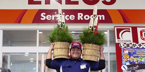 まずは東江サービスステーション、宮城主任の身体を張った謹賀新年ショットでご挨拶申し上げます。