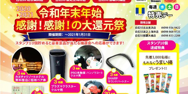 ENEOS白石サービスステーション3店舗合同(那覇大橋店・波之上海岸店・北谷美浜店)で、日頃からご来店して頂いているお客様へ、感謝の気持ちを込めて行います。