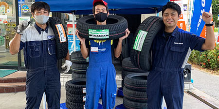 6・7・8月でタイヤ交換キャンペーンをしたので、タイヤメーカーの【沖縄ユアサ電池販売㈱】様のお二人とコラボしてタイヤ交換風景をお届けしたいと思います。