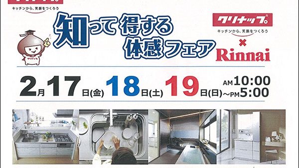 2月17日(金)~2月19日(日)の3日間、 クリナップ沖縄ショールームにて「知って得する体感フェア」が開催されます。 会場内では、グッドデザイン賞ベスト100に選ばれた「流レールシンク」や、あたたかい・安心・清潔の「ア…